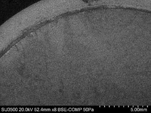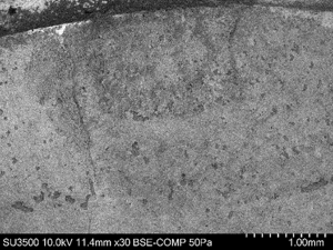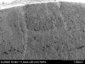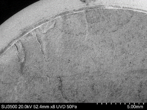 A Scanning Electron Microscope (SEM) was used to study the fracture surfaces. Unfortunately, heavy rusting obscured key features, preventing a clear determination of whether fatigue striations or stress-corrosion features were present. Normally, such surfaces would reveal distinct patterns that help identify the dominant fracture mechanism.