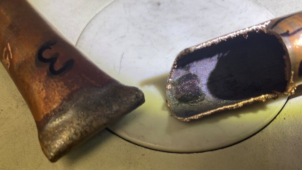 The copper pipe samples first underwent visual inspection and stereomicroscopy. Although no through-thickness cracks were visible, discoloration and abnormal surface features were noted inside the pipes.