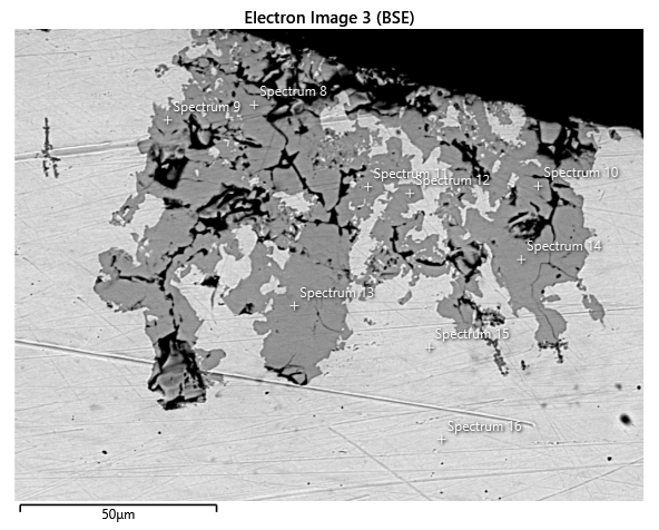 To better understand the corrosion mechanism, we used SEM coupled with EDS to analyze affected areas. The results were consistent: