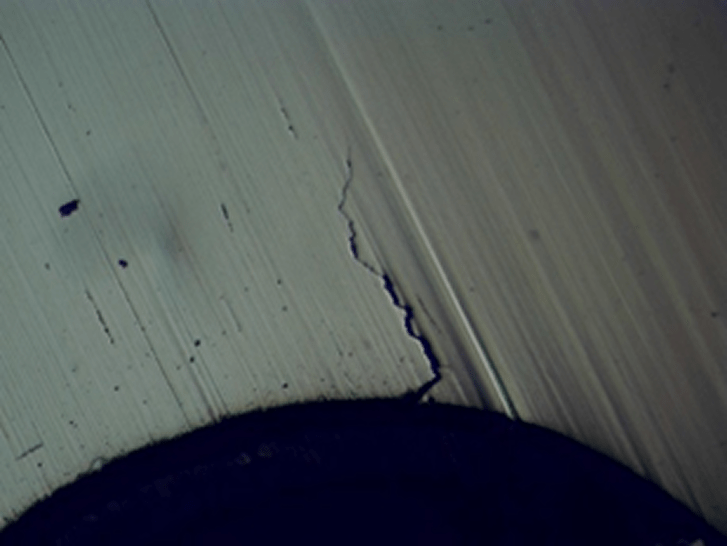 Optical microscopy revealed significant fatigue cracks at the root of the threads in the failed shaft. In contrast, the reference shaft showed no cracks. Additionally, the failed shaft exhibited strong banding in its microstructure.